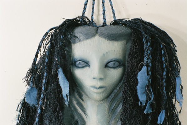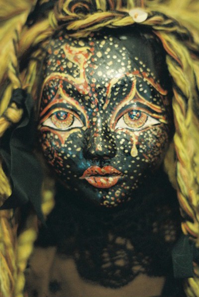 Microcrystalline wax head cast from a plaster mould. Calico body and clothing, dyed and painted. Dyed string hair.