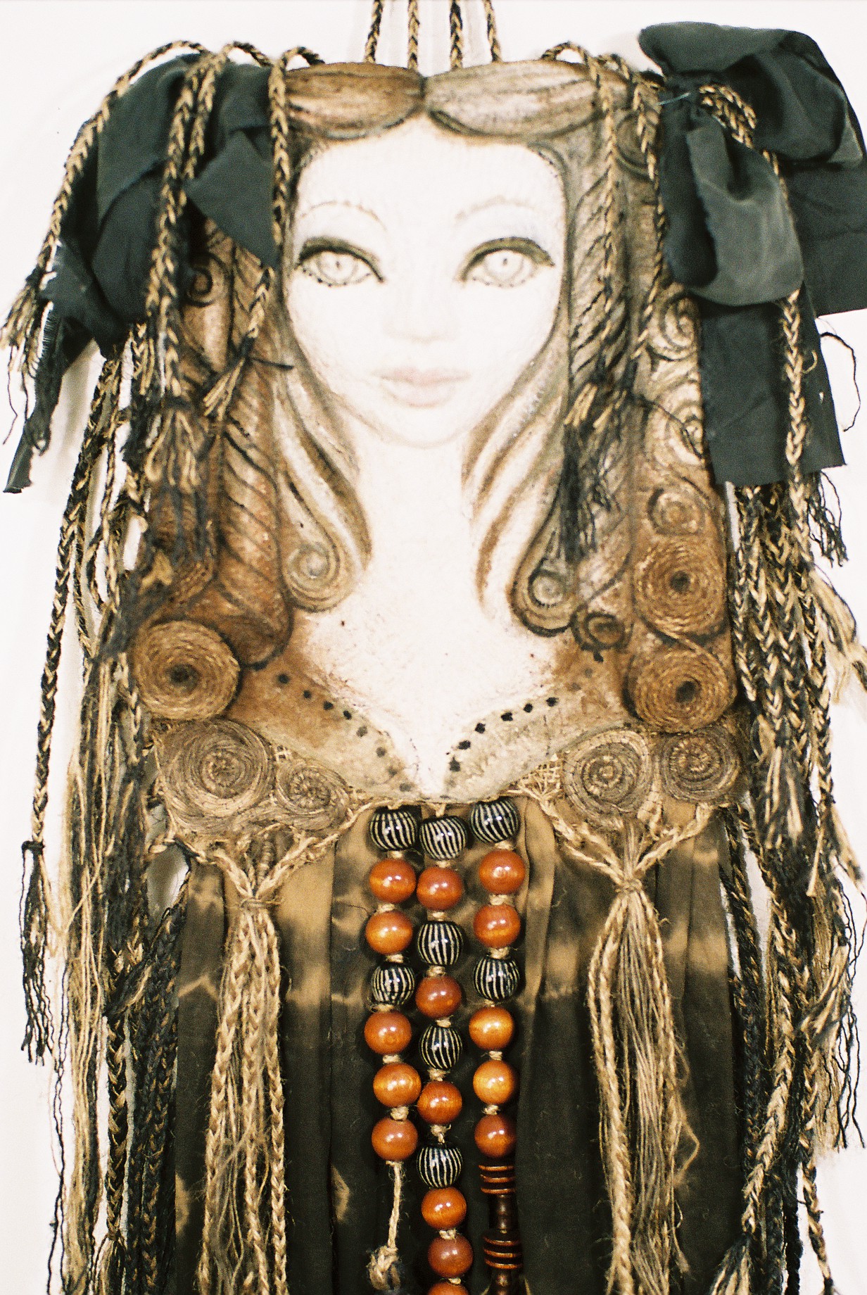 Originally the red haired doll was displayed on a circular backing board but she can also be displayed as a hanging piece of work.