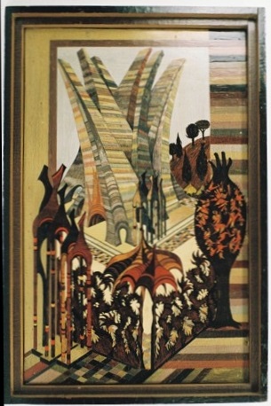 Materials: Casein paint and on chipboard mounted on a hessian covered board.