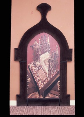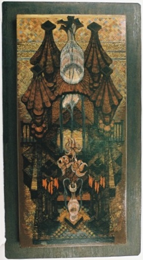 Materials: Casein paint and gold metalic paint on mahogany veneered plywood. Varnish: polyurethane and Windsor & Newton artists's Acrylic Gloss.