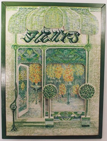 Frame made from polystyrene on a wooden support, covered with velvet. Picture area is painted in casein paint and gold paint on a cut out shape in hardboard.